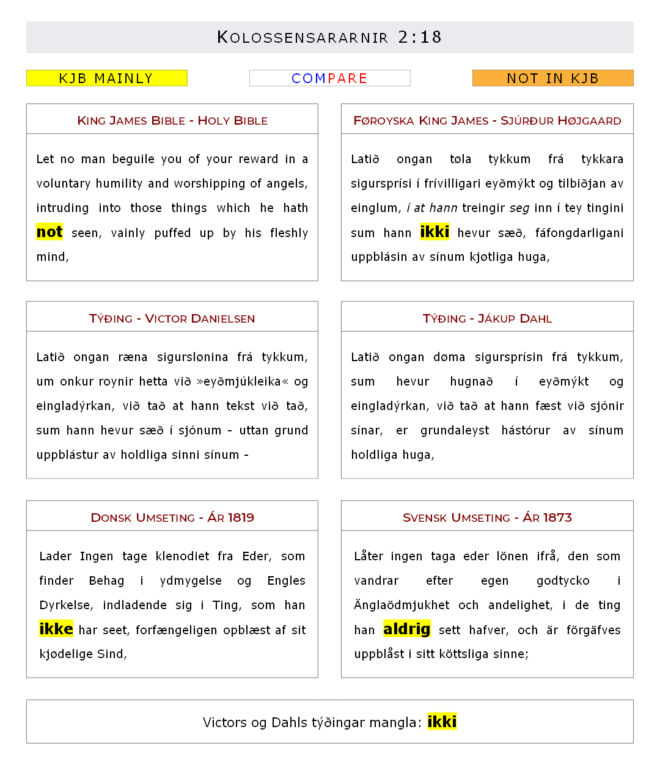 FKJ Latið ongan tøla tykkum frá tykkara sigursprísi í frívilligari eyðmýkt og tilbiðjan av einglum, í at hann treingir seg inn í tey tingini sum hann ikki hevur sæð, fáfongdarligani uppblásin av sínum kjøtliga huga,