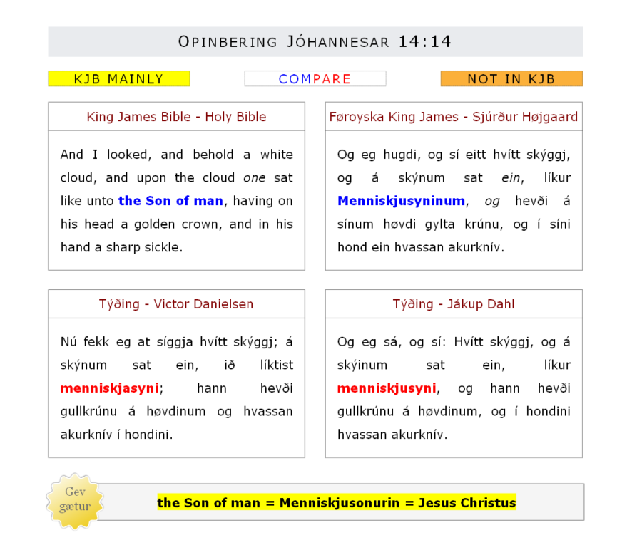 JD Og eg sá, og sí: Hvítt skýggj, og á skýinum sat ein, líkur menniskjusyni, og hann hevði gullkrúnu á høvdinum, og í hondini hvassan akurknív.