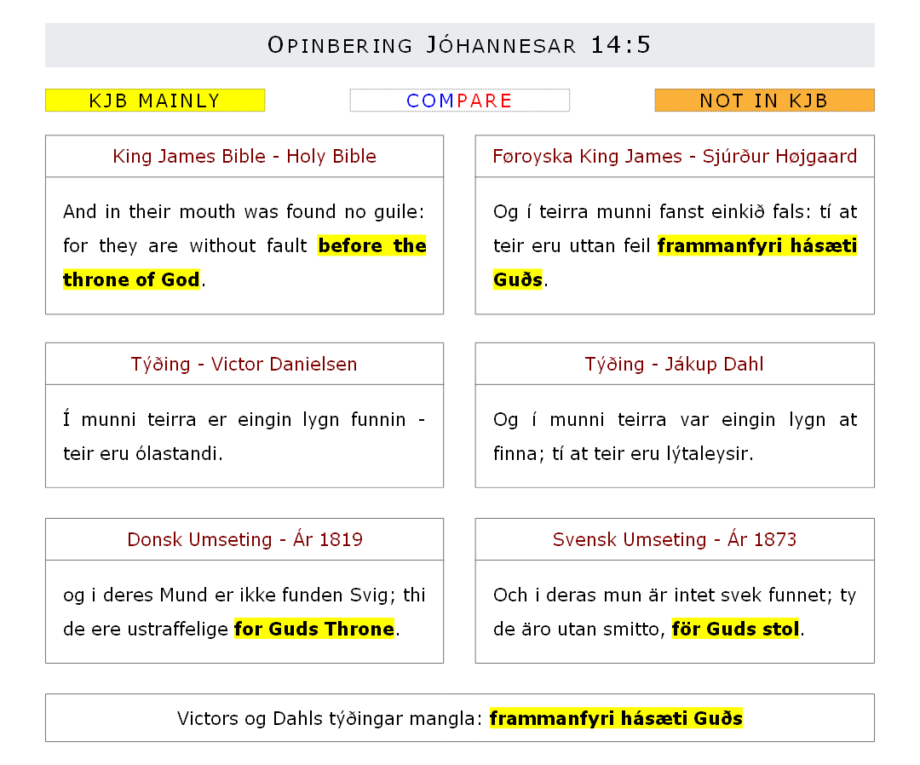 FKJ Og í teirra munni fanst einkið fals: tí at teir eru uttan feil frammanfyri hásæti Guðs.