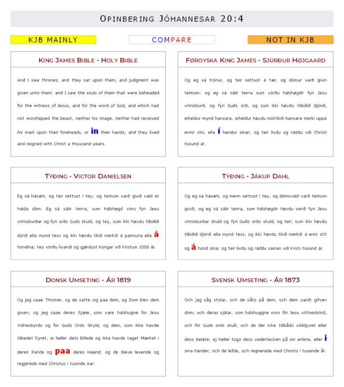 FKJ Og eg sá trónur, og teir settust á tær, og dómur varð givin teimum: og eg sá sálir teirra sum vórðu hálshøgdir fyri Jesu vitnisburð, og fyri Guðs orð, og sum ikki høvdu tilbiðið djórið, eiheldur mynd hansara, eiheldur høvdu móttikið hansara merki uppá ennir síni, ella í hendur sínar; og teir livdu og ráddu við Christi túsund ár.