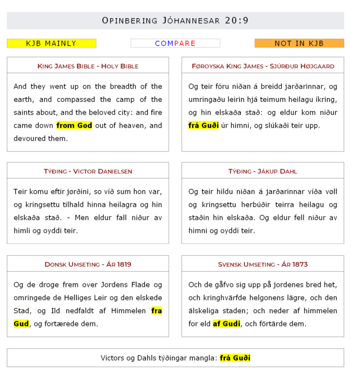 VD Teir komu eftir jørðini, so víð sum hon var, og kringsettu tilhald hinna heilagra og hin elskaða stað. – Men eldur fall niður av himli og oyddi teir.