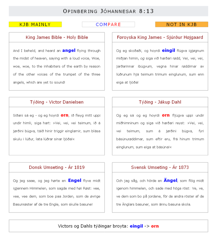 VD Síðani sá eg – og eg hoyrdi ørn, ið fleyg mitt uppi undir himli, siga hart: »Vei, vei, vei teimum, ið á jørðini búgva, táið hinir tríggir einglarnir, sum blása skulu í lúður, lata lúðrar sínar ljóða!«