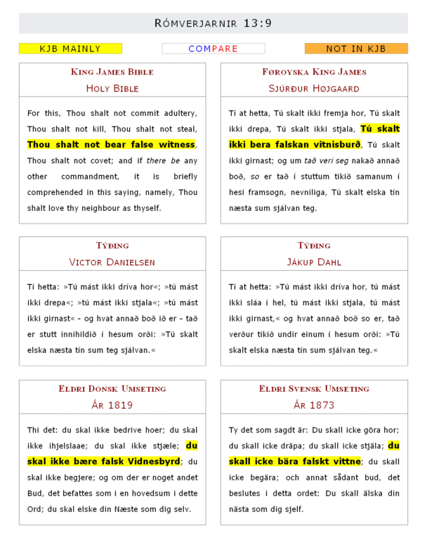 FKJ Tí at hetta, Tú skalt ikki fremja hor, Tú skalt ikki drepa, Tú skalt ikki stjala, Tú skalt ikki bera falskan vitnisburð, Tú skalt ikki girnast; og um tað veri seg nakað annað boð, so er tað í stuttum tikið samanum í hesi framsøgn, nevniliga, Tú skalt elska tín næsta sum sjálvan teg.